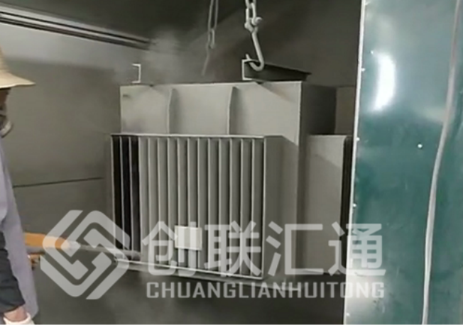 接下來會對變壓器進行一個特殊的化學處理,增加變壓器外殼的密封性和牢固性,然后進行噴粉。這個工種的師傅有點辛苦,夏季燥熱的車間,不得不全副武裝保護好頭部和面部。因為粉塵的確有點大。