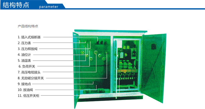該產(chǎn)品將高壓負(fù)荷開關(guān)、高壓熔斷器置于變壓器油中,具有與變壓器器身共箱或分箱兩種結(jié)構(gòu)形式。油箱采用全密封結(jié)構(gòu),配有油溫表、油位表、壓力表、壓力釋放閥、放油閥等元件以監(jiān)測變壓器運(yùn)行狀況。該產(chǎn)品分為環(huán)網(wǎng)型、終端型及電源型供電方式。為了使此種產(chǎn)品更適合于我電網(wǎng)的實(shí)際要求,公司又推了插拔型干式熔斷器,熔絲的熔斷不影響變壓器油的性能。根據(jù)低壓饋出要求的復(fù)雜程度,YBM-12/0.4型產(chǎn)品分為標(biāo)準(zhǔn)型、加強(qiáng)型和綜合型三種外殼形式,使用戶和設(shè)計單位在選型時,做到更靈活、更經(jīng)濟(jì)。